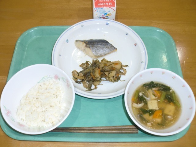 麦ごはん 牛乳 魚の西京焼き きざみこんぶの五目煮 吉野汁