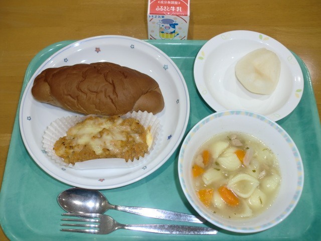 ココアパン 牛乳 ポテトグラタン マカロニスープ くだもの