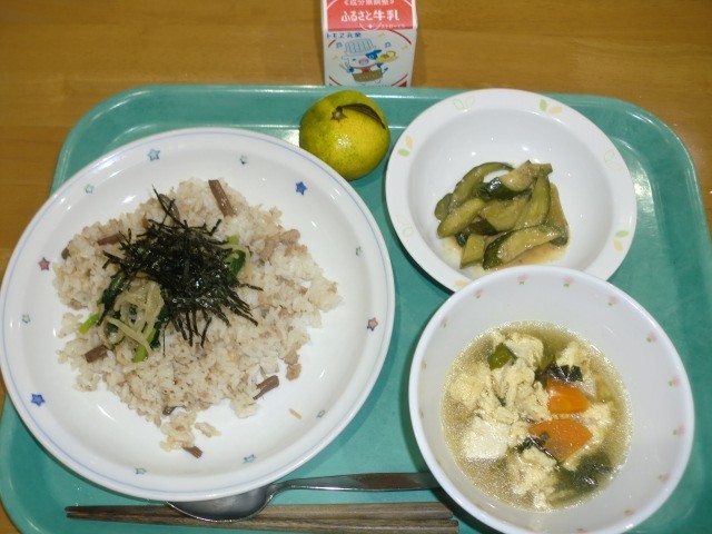 ビビンパ 牛乳 きゅうりのみそソテー わかめスープ くだもの