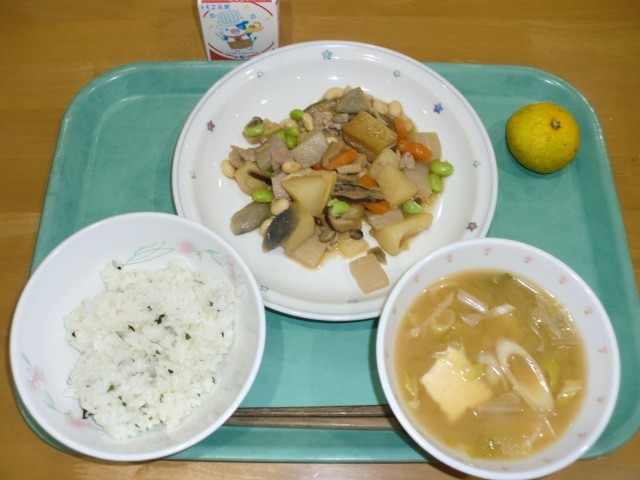 わかめごはん 牛乳 豆入り筑前煮 みそ汁 くだもの