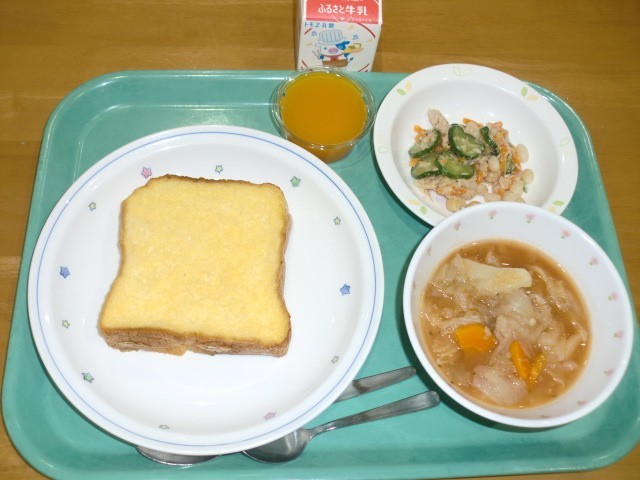 フレンチトースト 牛乳 ボルシチ ビーンズサラダ キャロットゼリー