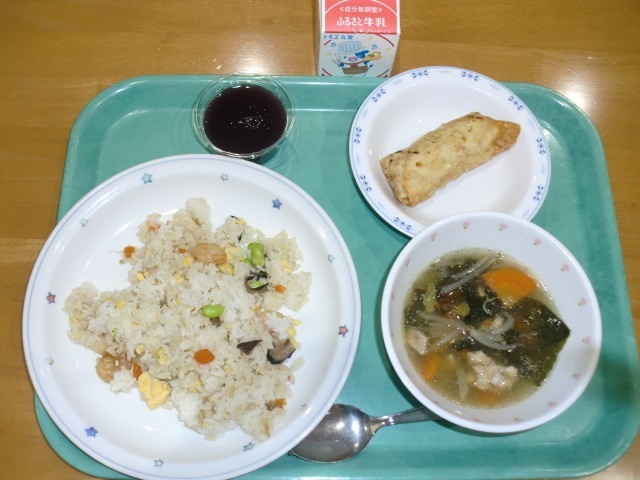 えびチャーハン 牛乳 小松菜とチーズカレー春巻き わかめスープ ぶどうゼリー