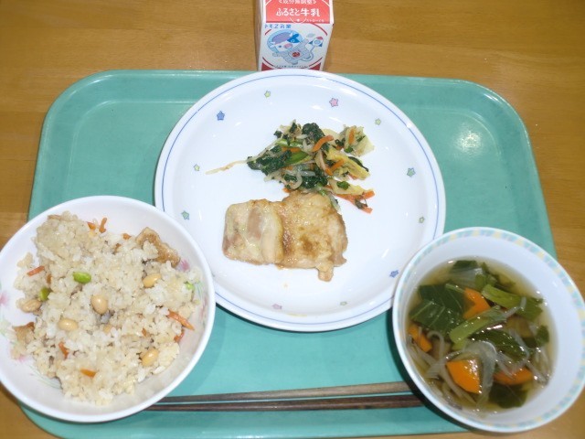 大豆入り子ぎつねごはん 牛乳 鶏肉の照り焼きソース 野菜のおかかかけ せたがや根菜汁
