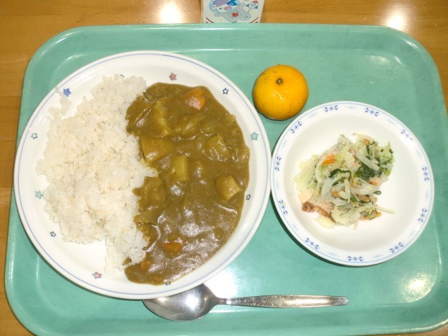 カレーライス 牛乳 ベーコンと水菜のサラダ くだもの