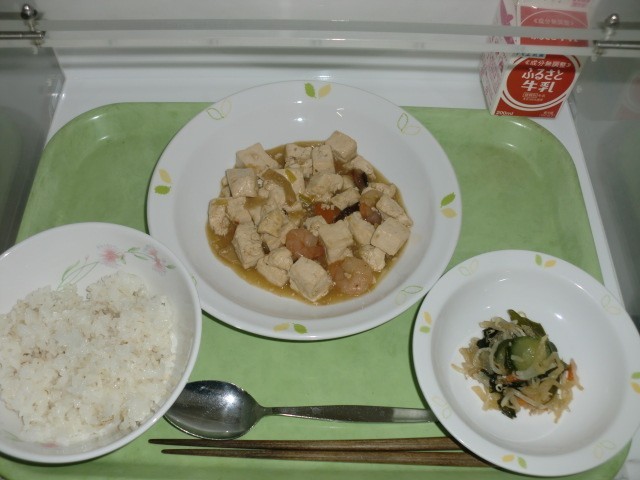 麦ごはん 牛乳 豆腐の五目炒め じゃこサラダ