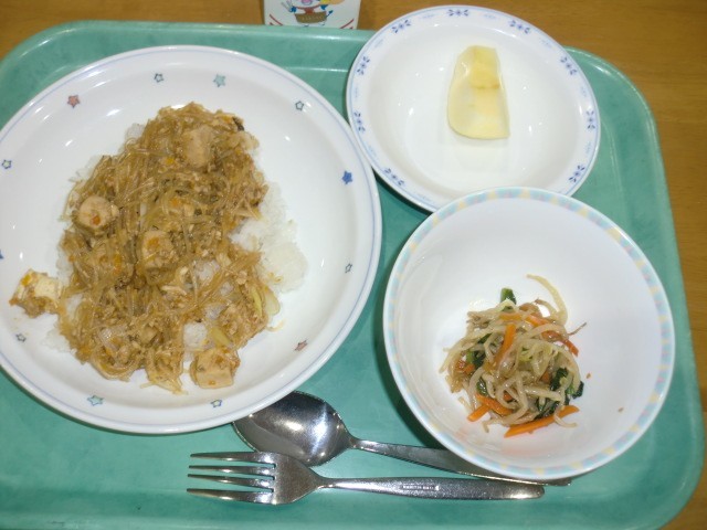 麻婆豆腐丼 牛乳 ナムル くだもの
