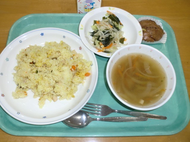 パエリア 牛乳 コーンサラダ コンソメスープ さつまいも入り蒸しパン
