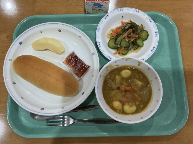 コッペパン・いちごジャム 牛乳 カレーシチュー 野菜のレモンしょうゆかけ くだもの