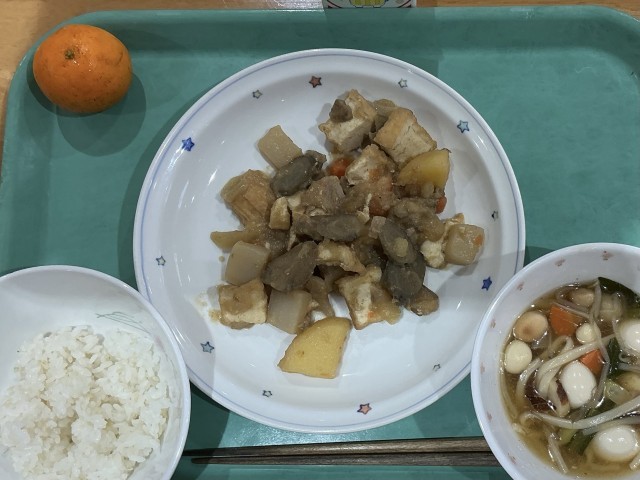 本日の給食(2月3日火曜日) 公開日 2026/02/03 更新日 2026/02/03 給食 ⚫︎本日の献立⚫︎麦ごはん 牛乳 五目うま煮 あんかけ汁 くだもの⚫︎主な給食食材と産地⚫︎米(宮城) 豚肉(茨城) ごぼう(青森)にんじん(千葉 熊本) じゃがいも(北海道) 玉ねぎ(北海道)鶏肉(岩手) もやし(栃木) ねぎ(千葉)小松菜(茨城) ぽんかん(愛媛) いいね(0)