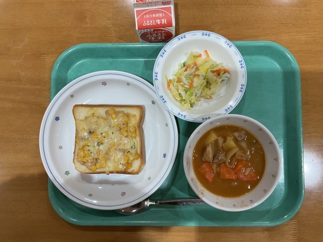 本日の給食(4月8日水曜日) 公開日 2026/04/08 更新日 2026/04/08 給食 ⚫︎本日の献立⚫︎ツナコーンチーズトースト 牛乳 ポークシチュー キャベツサラダ⚫︎主な給食食材と産地⚫︎パセリ(千葉) 豚肉(茨城) 玉ねぎ(北海道)にんじん(熊本) じゃがいも(鹿児島) キャベツ(神奈川) いいね(0)