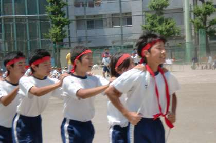 2年の学年種目は「小ムカデ」です。グループの息を合わせながら、トラックを走りました。