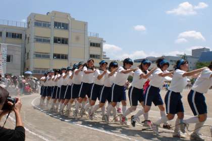3年生はクラスを男女に分けた「大ムカデ」 トラックに砂煙をあげて驀進していきました。