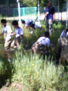 胴長をはいてビオトープの水草を抜きました。赤とんぼもいました。