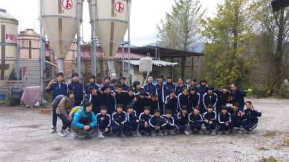 B組は小林牧場で牧場体験です。 サイロの前でクラス写真です。 これからバター作りを始めます。