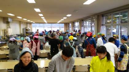 恒例のうどん作りをやつています。 班毎にこね、うち、切って、茹でていきます。