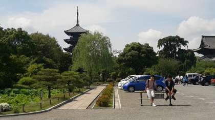 修学旅行2日目の班行動が始まりました。京扇子、安達くみひも、西陣織などの京都ならではの体験学習、寺社の見学を行います。東寺五重塔前にて