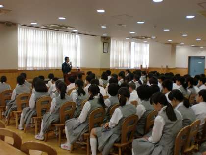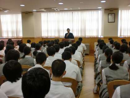 2年生は9月に控えた職場体験を前に、印材社社長の朝生公章氏の話を