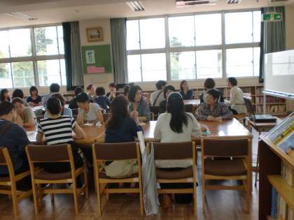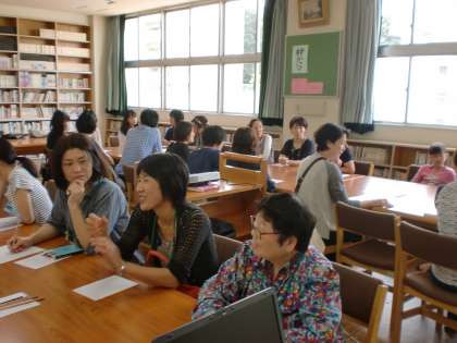 道徳授業地区公開講座で薬師寺先生のお話を聞いた後、地域の方も交えて単P研修を行いました。少人数のグループに分けて話し合いをした後、各グループの代表者が発表して全員で共有するという形で行いました。