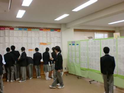 鎌倉校外学習 体験学習作品・班新聞、職場体験新聞、歴史新聞、そっくりアート、花と貝の絵、刺し子のウォールポケットが展示されています。
