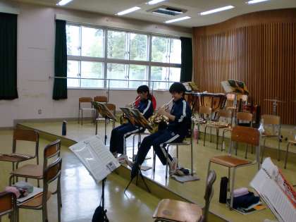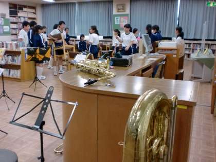 土曜の放課後、図書室でも吹奏楽部のパート練習が行われていました。