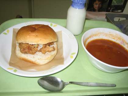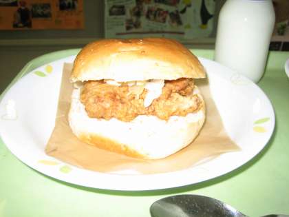 大きめの鶏肉をはさんだハンバーガーを食べる子どもたちは
