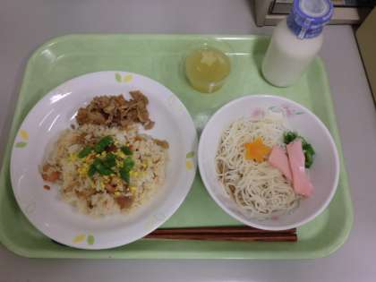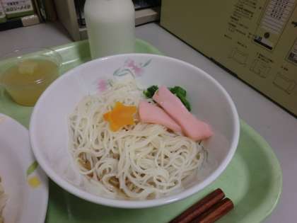 天の川に見立てたそうめん、短冊に見立てたピンクのかまぼこ、そして星のオクラと