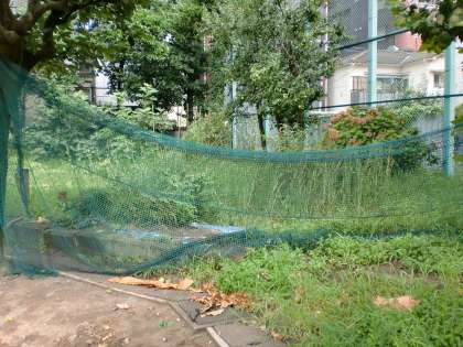 南側の鳥よけネットにつなげて 畑全体を覆う予定でしたが、本日は 雨のために延期しました。
