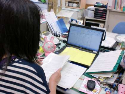 事務室では、9月に実施する1年生の河口湖移動教室に向けて