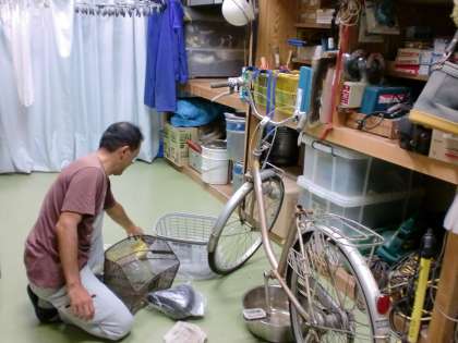 いる地域パトロール用自転車のサドルやカゴを修理していました。