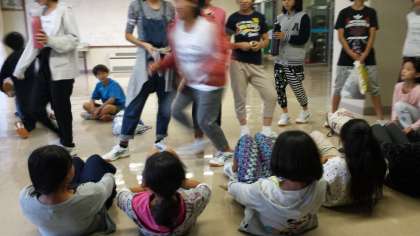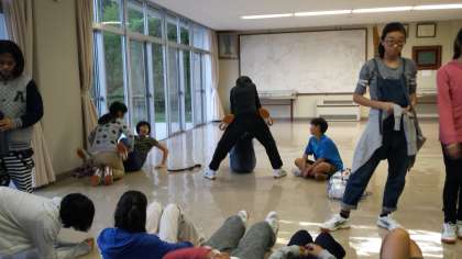 夕食の待ち時間を利用して、体幹トレーニングがバレー、ソフテニを中心に始まりました。