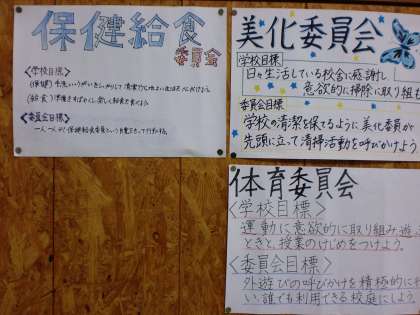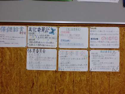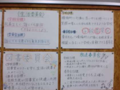 各委員会後期目標 公開日 2015/11/13 更新日 2015/11/13 学校日記 各委員会前期目標が渡り廊下に掲示してあります。 各委員会後期になったので新しい目標に貼り変えていきます。 いいね(0)