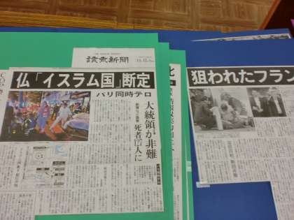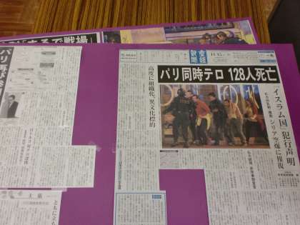 パリでのテロ事件。どの新聞社も紙面を多く割いての報道です。