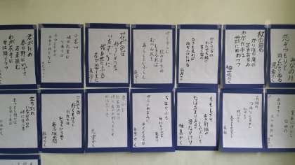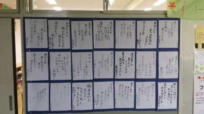 百人一首 公開日 2015/12/03 更新日 2015/12/03 学校日記 一年生の廊下に筆で書かれた百人一首が掲示されています。 1月には百人一首大会を行うそうです。 冬休みには百首全部覚えられるかな? いいね(0)