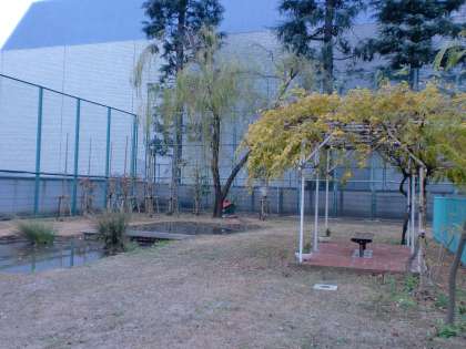ビオトープ前の憩いのベンチにガーデニング部が