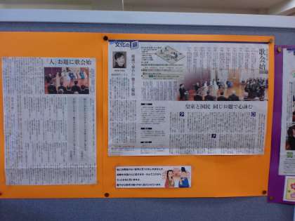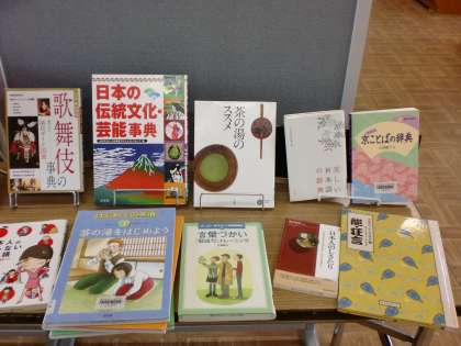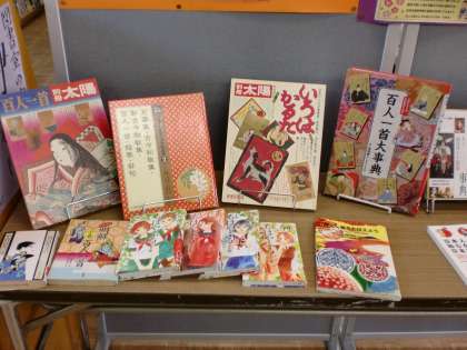 図書室の展示、正面には「百人一首」「伝統・文化」の書籍、 新聞記事の「歌会始」が展示されています。