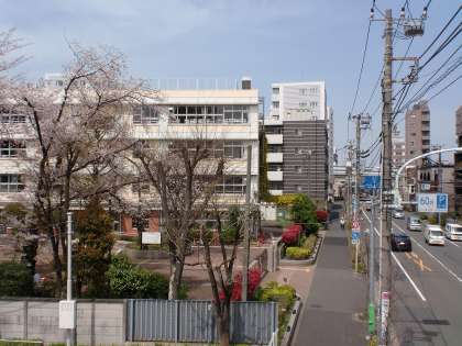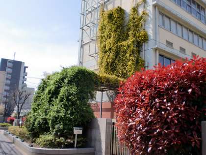 校舎と桜、緑のカーテンがピンク、緑、赤と
