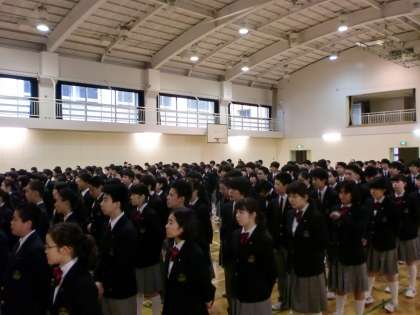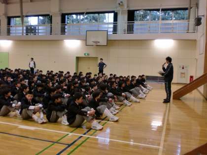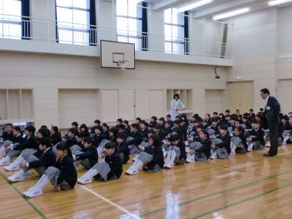 写真は全校朝会、その後行われた1年生学年集会、