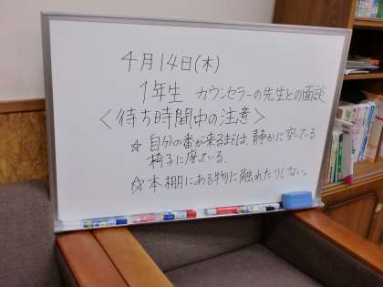 スクールカウンセラーによる全員面接 公開日 2016/04/14 更新日 2016/04/14 学校日記 現在1年生は健康診断等と並行して、 学校生活を安心してスムーズに送ることが できるようにスクールカウンセラーによる 全員面接(個別面接)を順次実施しています。 写真は相談室内で待機している生徒です。 相談室内の別室で一人ひとり面接を行います。 今回は長い時間は確保できませんが、必要に 応じて個別の相談を実施することもできます。 いいね(0)