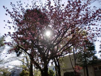 八重桜の間から朝日が見え、風情がありました。