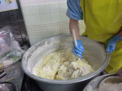 300人分の生地はとても重く、練るのに汗だくになりますが、