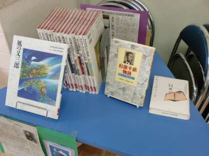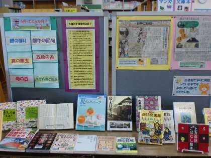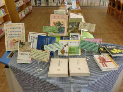 図書室の展示コーナーが変わりました。 5月に縁のある作家たち、他です。