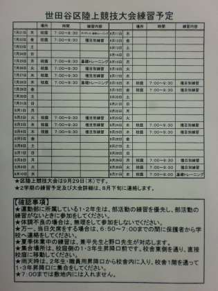 世田谷区陸上競技大会練習会 公開日 2016/07/20 更新日 2016/07/20 学校日記 今年度より、9月末に実施する区の陸上競技大会の練習を 夏休みから開始することになりました。 日頃実施している「陸上競技教室」の生徒を中心として、 選抜された候補選手が、夏休みの練習に参加します。 夏休みの練習は、部活動の練習を最優先としますが、 候補選手が、陸上の練習予定日の中で、参加できる日を 自ら考え自主的に参加して、優勝を目指します。 いいね(0)