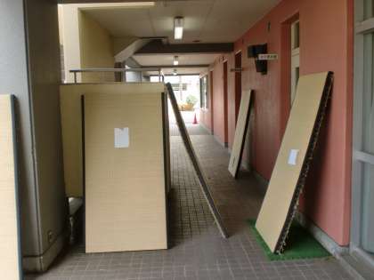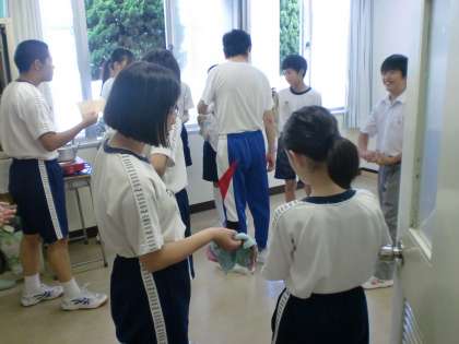 茶道部が茶室の大掃除を行っています。 畳は干して風通しを行っています。