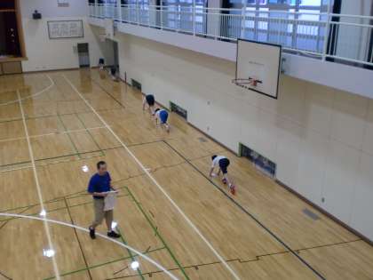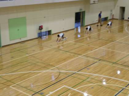 体育館の雑巾がけ。各人2〜3秒間の間隔をあけ
