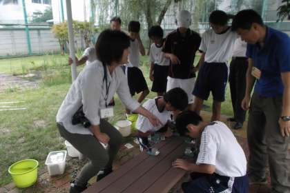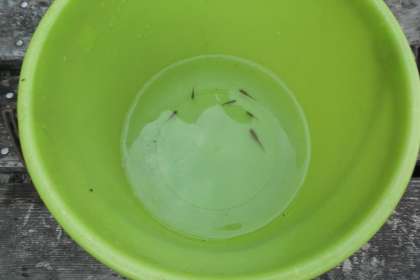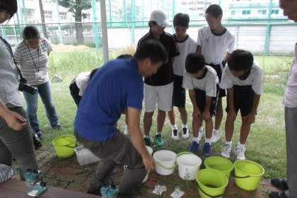 バケツに集めた生き物を種類ごとに シャーレに移し顕微鏡で観察しました。