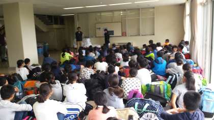 移動教室3日目も晴れ。 朝礼、閉園式を行い、これから富士山五合目に向かいます。