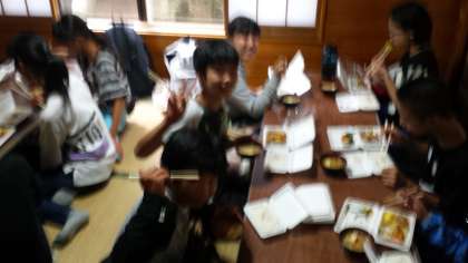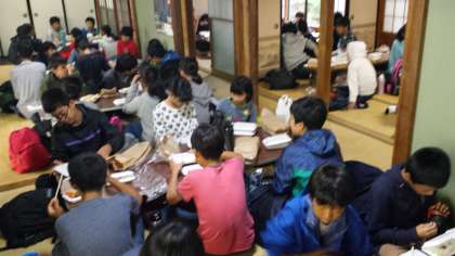奥庭荘でけんちん汁でお弁当をいただきました。 予定通りに学校へ向かいます。