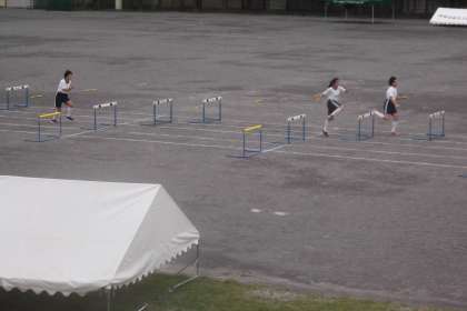 2ABの男子は体育館でマット運動 女子は校庭でハードル走を行っていました。