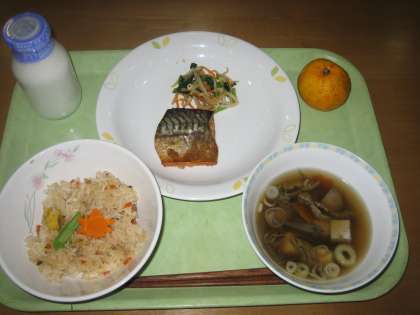 今日はご飯に栗、魚は旬のサバ、おひたしには菊の花