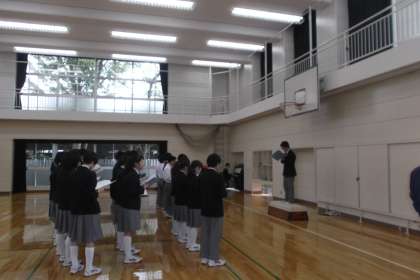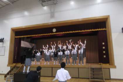 体育館では舞台の上で手拍子の練習をしていました。